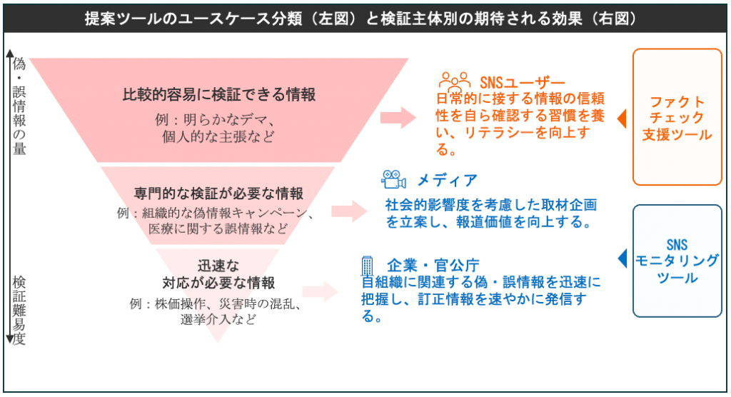 社会全体の情報検証能力を底上げ:検証が比較的容易な情報はSNSユーザーが自ら対応し、専門的な検証が必要な情報はメディアや企業・官公庁が担う、という検証難易度に応じた社会的な役割分担を促進します。これにより、情報発信側に比べて検証側のリソースが圧倒的に不足する「非対称性」という構造的課題の解決を目指します。